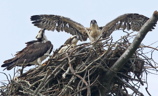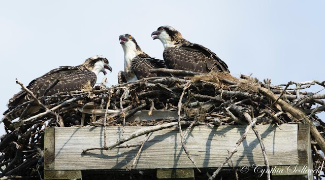Yesterday, a floater Osprey, also known as an intruder, flew around the nest territory for close to five minutes, disturbing both the adults and offspring. The floater repeatedly circled the nest, crisscrossed the territory, and then shot up a hundred feet and back down to torment Ursula. Lilly joined Ursula in the alarm call, followed by Milly, and finally Silly. The chicks did their best to call out menacingly as they imitated their mother screaming at the intruder to skedaddle. Just as he was about to leave the territory, Orpheus came out of nowhere and chased it northward, over the lake.