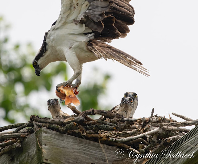 Orpheus continues to deliver fish to Ursula to the chicks. She now encourages them to pick the fish apart by themselves. The larger chick generally gets the first delivery of the day leaving only leftovers for the smaller chicks. If a second delivery comes when the larger chick is still satiated, the smaller chicks get all the fish.