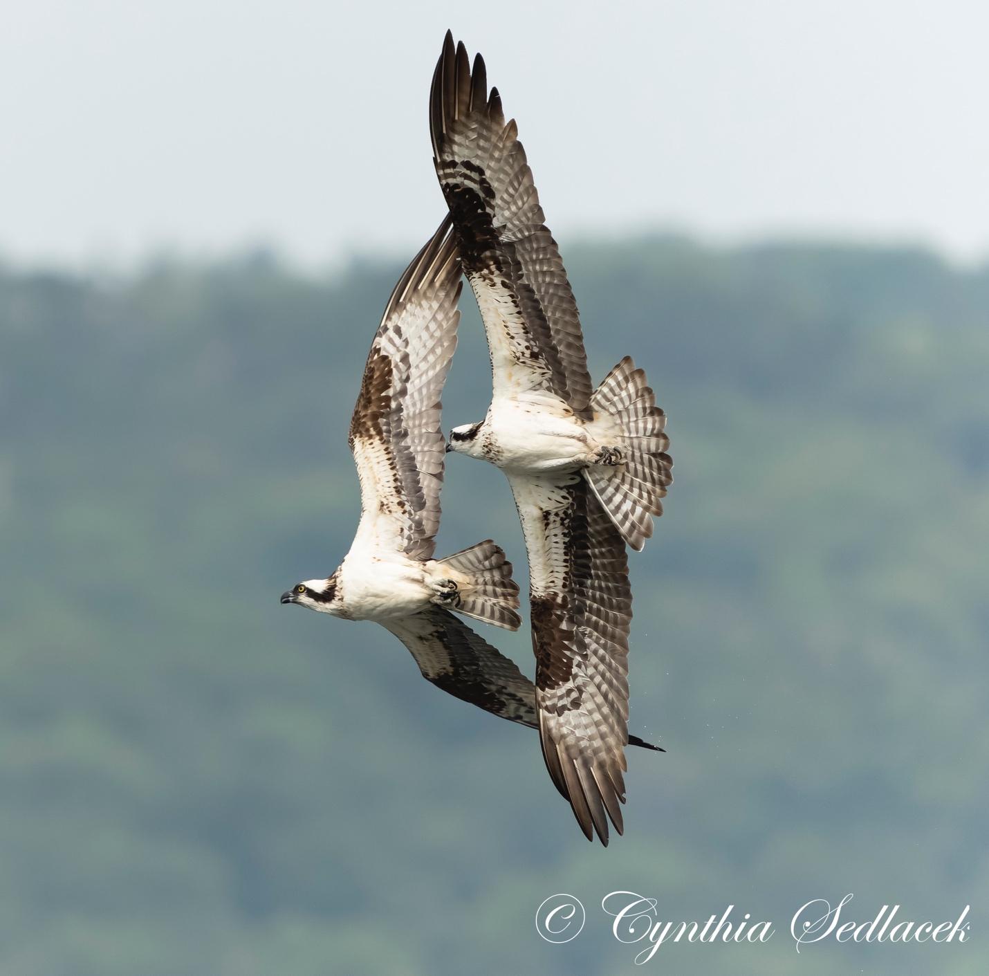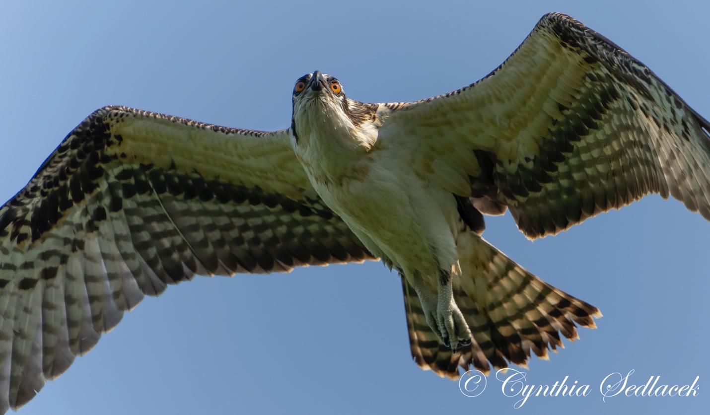 Cynthia Sedlacek, musician and Director of Data Administration and Reporting at Cornell University, is a surprising artistic talent. Cynthia’s affection and admiration for raptors are evident in her exciting photographs primarily of Ospreys nesting around Cayuga Lake and the red-tailed hawks of the Cornell Campus. Her photographs of local Ospreys are incomparable as she captures their essence, their jizz, and their inner bird. From the hard-to-see nestlings to the fast-flying adults, Cindy goes beyond the pale to catch all aspects of Osprey life in the Cayuga Basin. “My camera allows me to capture their beauty in many ways that the human eye can’t see,” she says, “like their spectacular wing positions and detailed feather patterns.” Cindy and her husband Karel are also avid nest monitors for the Cayuga Lake Osprey Network and video stream footage of the campus hawks.