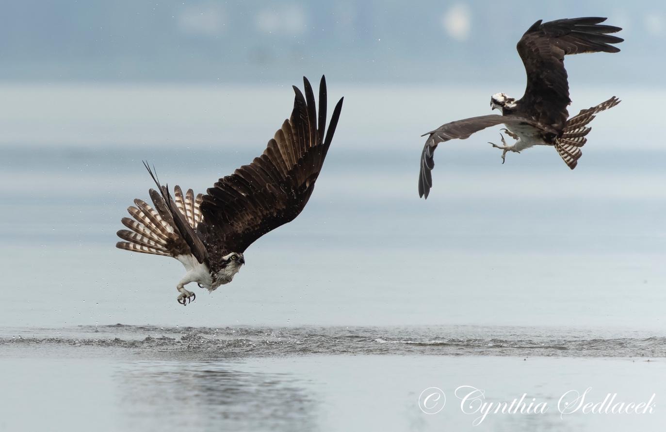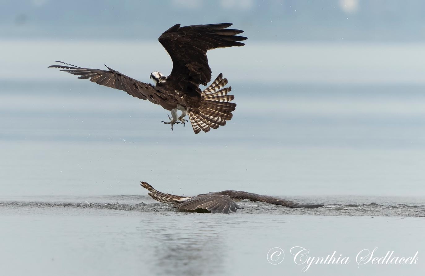 The birds start the dive with a reconnaissance flight about 100-200 feet above the lake looking for accessible fish. When a fish is spotted, the bird hoovers until the prey is locked in its sights. Suddenly, the Osprey will dive head first, like a missile locked on its target, heading for the water at 50-60 mph. All this time the bird is correcting for the movement of the fish. Just as it reaches the water, the bird pulls a wheelie, jutting its legs in front of its head with claws wide open. It plunges into the water grabbing the fish and rows its wings backwards to reach the surface again. The Osprey adjusts the fish in its claws so that the fish is aerodynamically head first and easier to fly with.