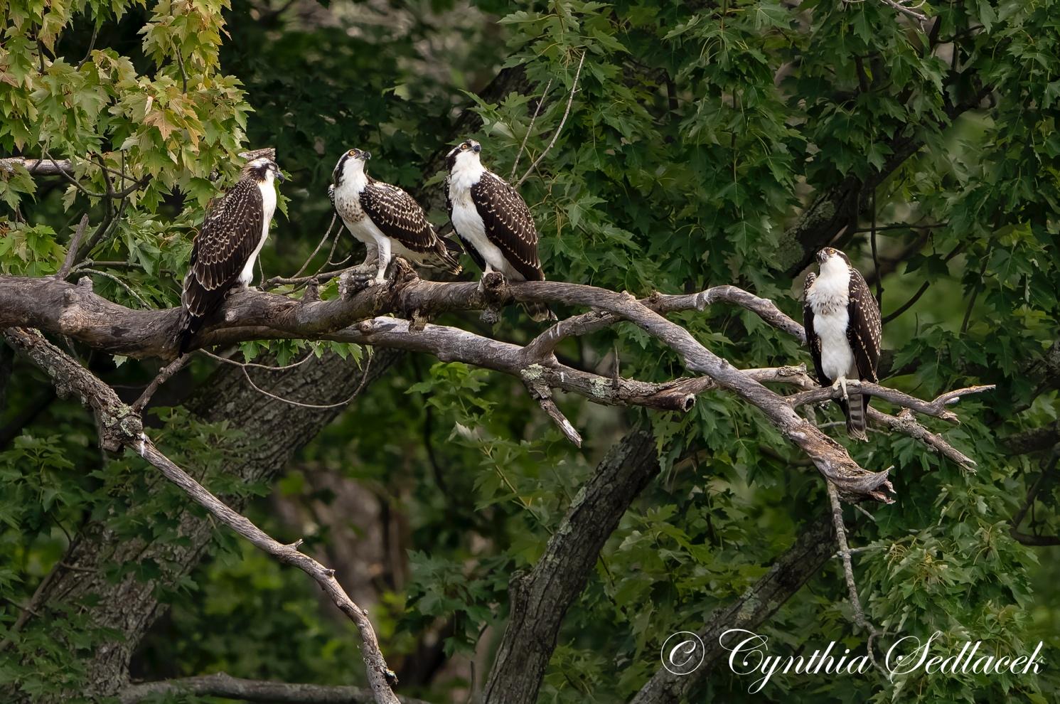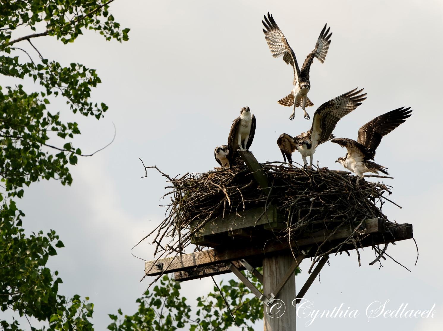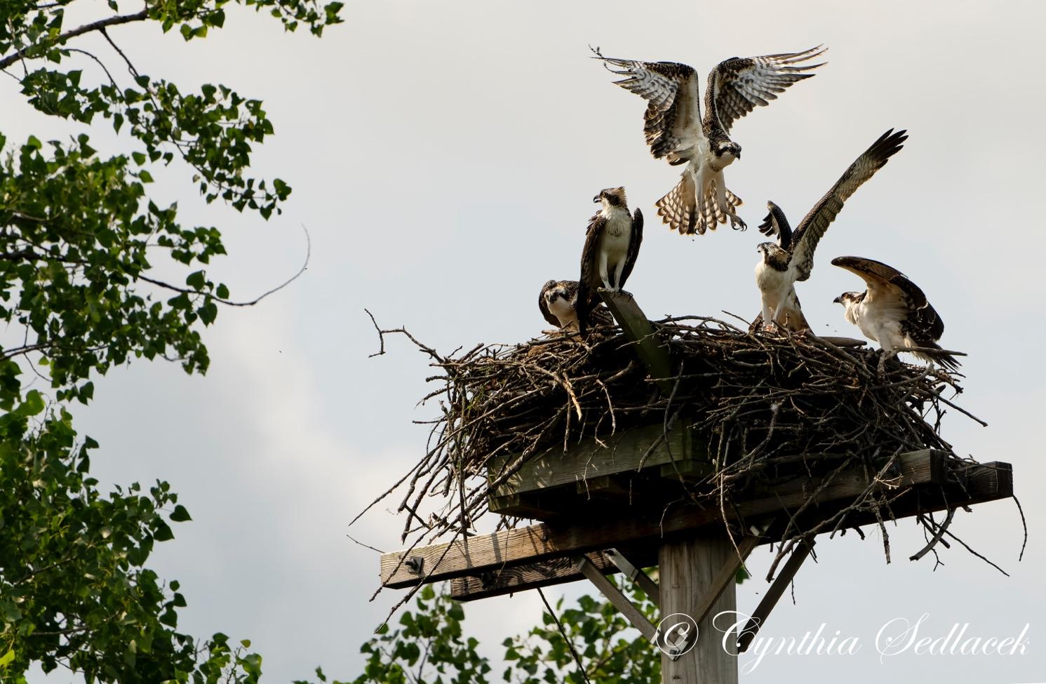 Two resident fledglings welcome three neighbor fledglings to their nest, courtesy of Cindy Sedlacek.