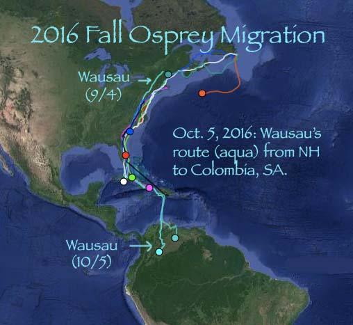 The 2016 map (below) shows a fall migration route of an adult Osprey. In this case, the male Osprey named Wausau (route is in aqua) flew from NH to Colombia in 31 days. The other colors represent radio signals from other Ospreys tracked by Dr. Rob Bierregaard.